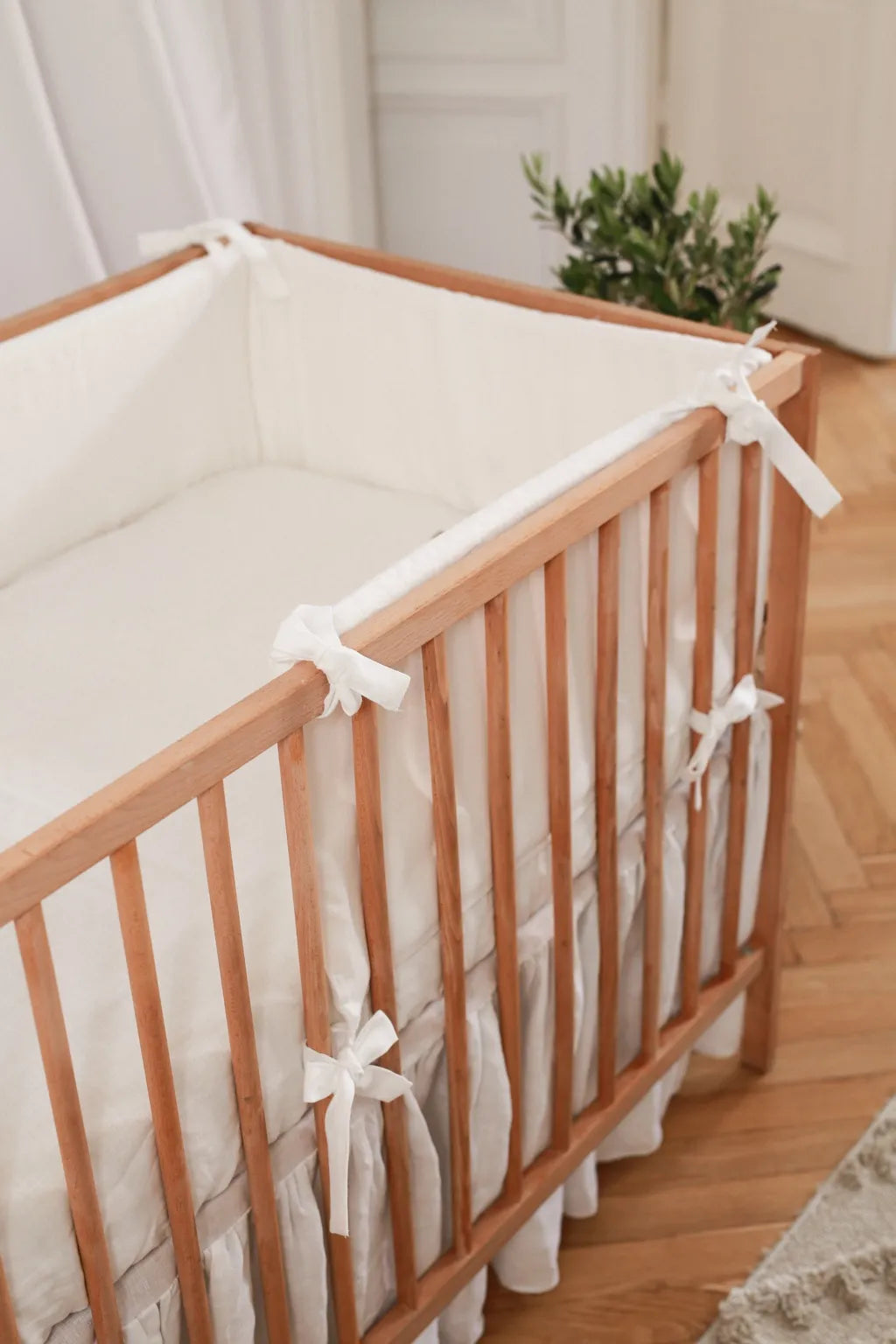 Onze ledikantbumper, bevestigd aan de spijlen met strikjes en gemaakt van zacht linnen, biedt optimale bescherming voor je baby tijdens het slapen of spelen in het bedje. Deze bumper beschermt tegen de pijnlijke impact van kleine avonturiers die zich al kruipend of rollend door het ledikant bewegen. Dankzij de schuimvulling absorbeert deze beschermer schokken veel beter dan bumpers gevuld met siliconen non-woven stof. De hoes is afneembaar, waardoor deze eenvoudig te wassen of te vervangen is.