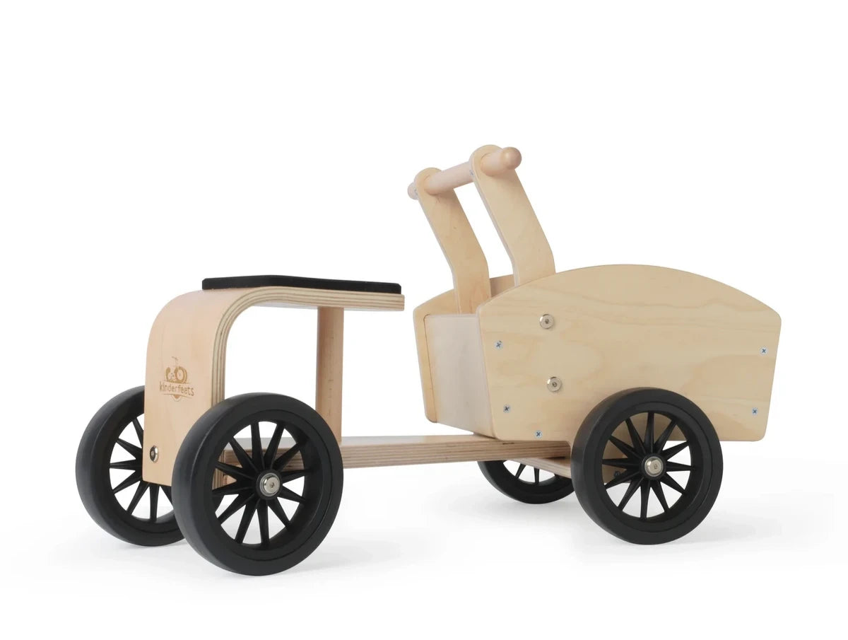 Let op! Levertijd 1-3 werkdagen Geïnspireerd door de originele Nederlandse Bakfiets, is de Kinderfeets Bakfiets een 4-wiel duwfiets met een grote laadruimte vooraan voor speelgoed, schatten en knuffelvrienden. De EVA airless banden beschermen oppervlakken tegen krassen en garanderen een stabiele, soepele rit; en door hun voeten te gebruiken om de fiets aan te drijven, ontwikkelen kinderen zich fysiek op verschillende manieren!Nodig uw kind uit om zijn mobiliteit te testen, de grove motoriek te ontwikkelen en zijn evenwicht en coördinatie te verbeteren door actief te spelen met een voertuig dat kan worden bereden, geduwd, getrokken of als opslagruimte kan worden gebruikt. Kijk hoe ze meer zelfvertrouwen krijgen tijdens het cruisen en zie welke schatten ze tijdens hun avonturen vinden! De bakfiets is gemaakt van duurzaam berkenhout, verf op waterbasis en niet-giftige afwerkingen en biedt actieve peuters van 12 maanden en ouder de kans om het leven op wielen te verkennen met hun favoriete speelgoed en knuffels mee voor de rit.Afmetingen: (L x B x H): 66x35.6x38 cm. Gewichtslimiet 20kg. Te gebruiken vanaf 12 maanden.  Verkrijgbaar in natuurlijk hout