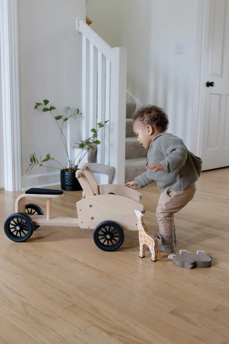 Nodig uw kind uit om zijn mobiliteit te testen, de grove motoriek te ontwikkelen en zijn evenwicht en coördinatie te verbeteren door actief te spelen met een voertuig dat kan worden bereden, geduwd, getrokken of als opslagruimte kan worden gebruikt. Kijk hoe ze meer zelfvertrouwen krijgen tijdens het cruisen en zie welke schatten ze tijdens hun avonturen vinden! De bakfiets is gemaakt van duurzaam berkenhout, verf op waterbasis en niet-giftige afwerkingen en biedt actieve peuters van 12 maanden en ouder de kans om het leven op wielen te verkennen met hun favoriete speelgoed en knuffels mee voor de rit.