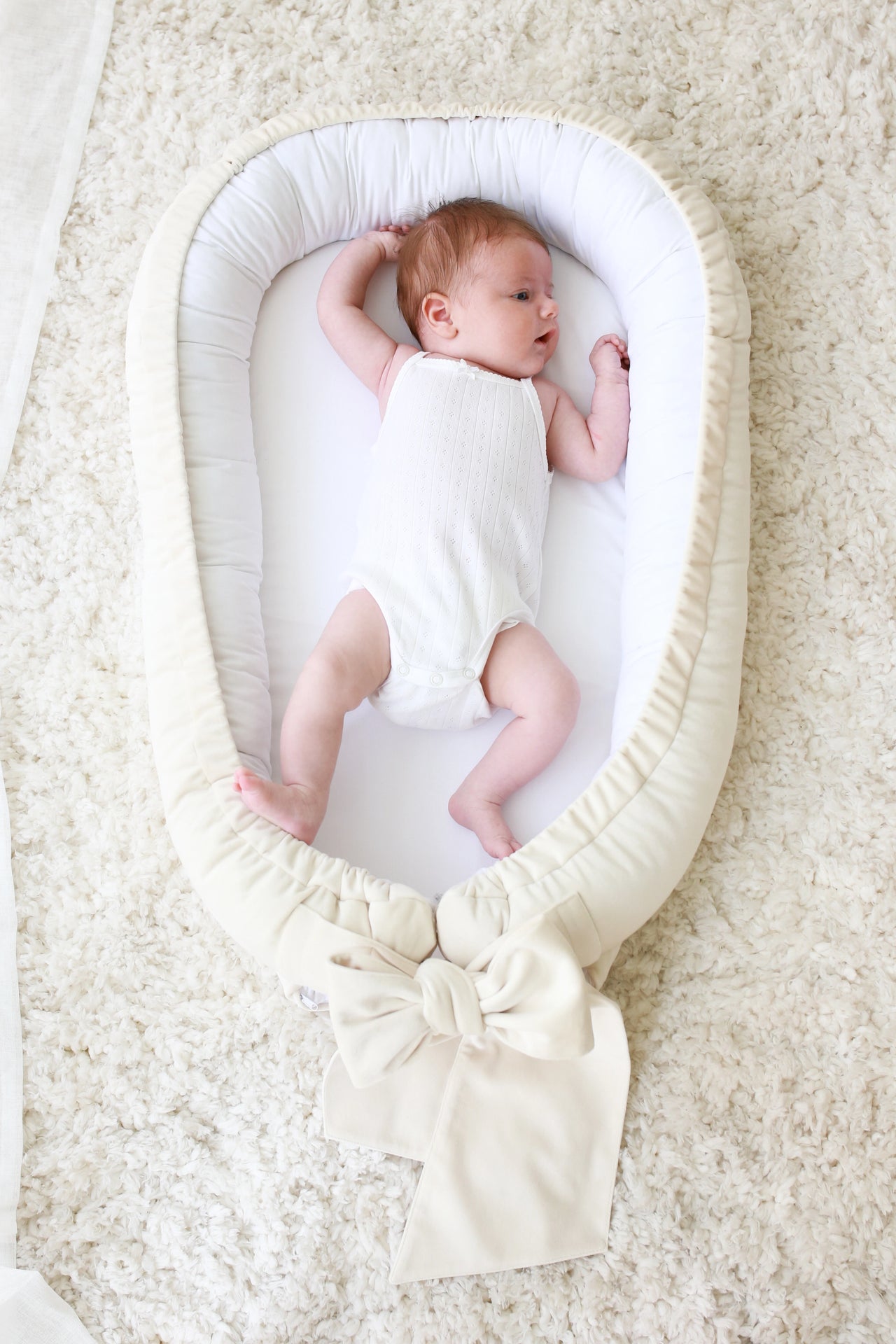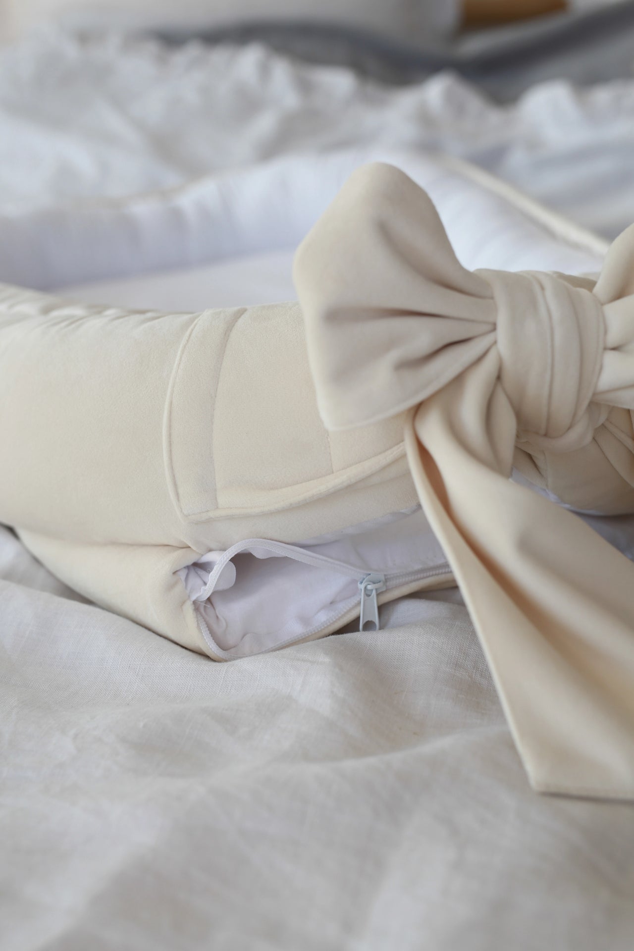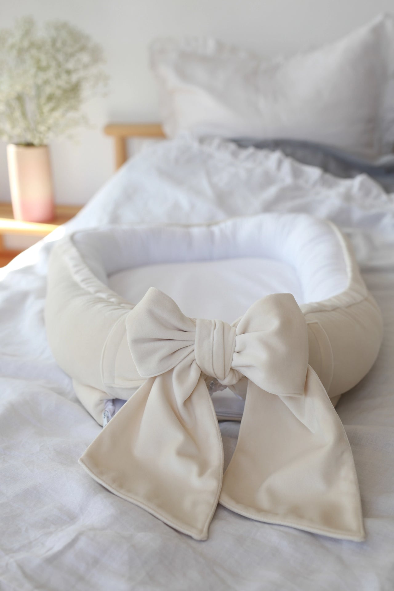 Dit leuke babynest van fluweel met katoen is beschikbaar in deze 5 kleuren: Cream Pearl, Beige, Dirty Pink, Mint, Light Gray.
